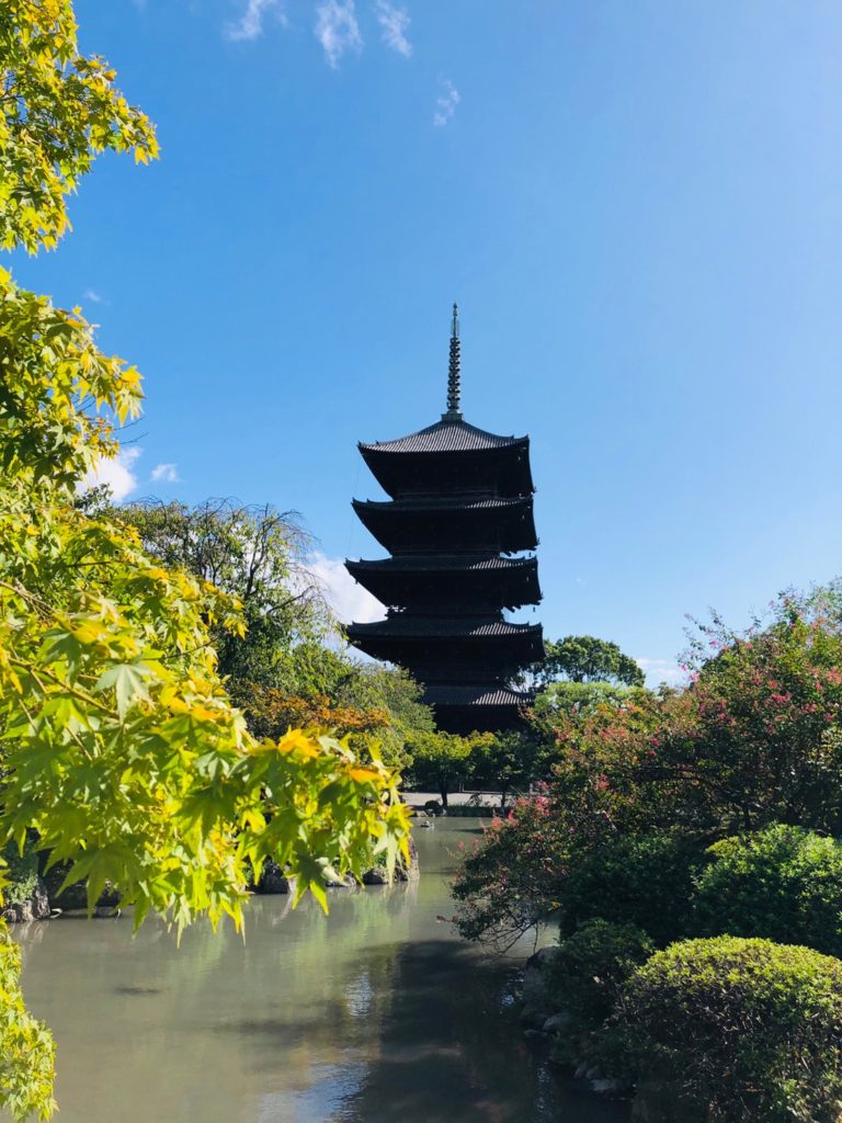 また、京都駅にほど近い東寺は大きな池があり、見た目が涼やかです。夕方訪れると夕焼けと五重塔と池との幻想的な世界が広がります。また、夜にはライトアップされることもあり、池に映る光の世界は一度は見てみたい光景です。