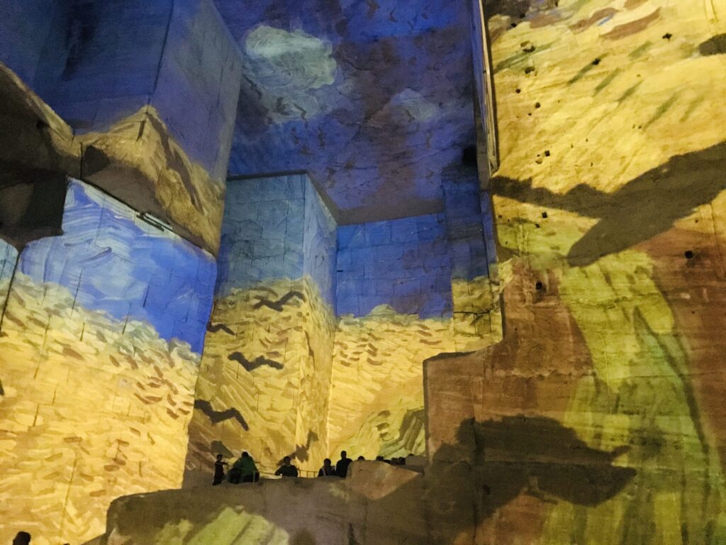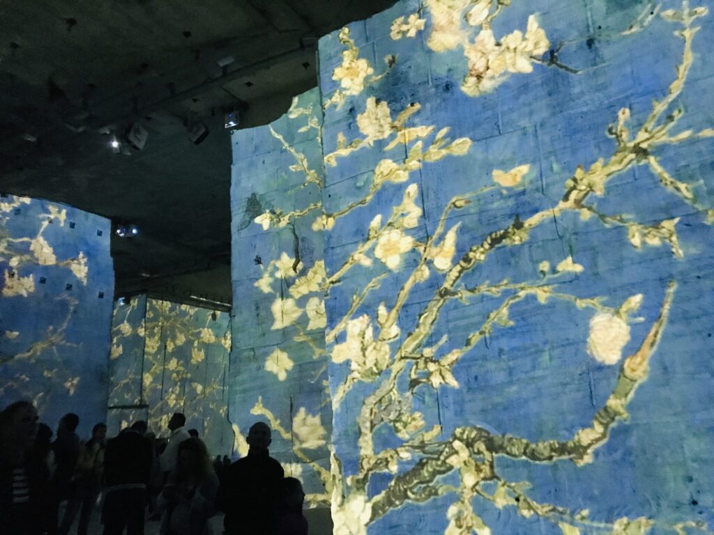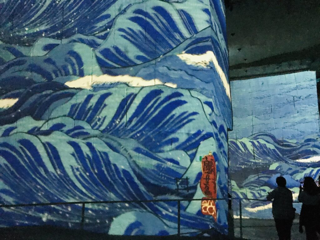 季節ごとにプロジェクションマッピングが変わり、いつも人気で混み合っています。私が行った時は、ゴッホと日本の2部構成のテーマでした。